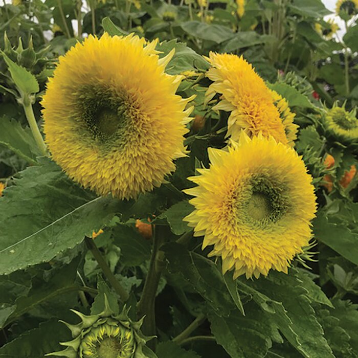 A new type of ‘teddy bear’ sunflower, with the same cuddly flowerheads but this time in a cool lemon yellow that contrasts beautifully with the dark green leaves. Sunflower ‘Gummy Bear’ has a multi-branching habit, producing numerous fluffy flowers at the top of each plant. Each 3-5 inch flowerhead is densely packed with petals and produces minimal pollen making it perfect for cutting. Its outstanding garden performance has been recognised with a Fleuroselect Gold Medal. Grow in borders or containers. Kids will love them! Height: 170cm (67in). Spread: 90 cm (35in)